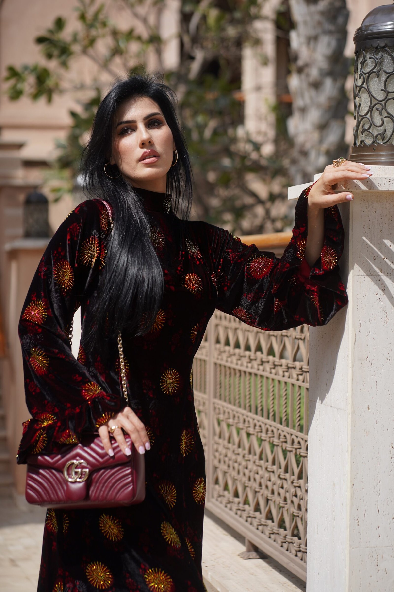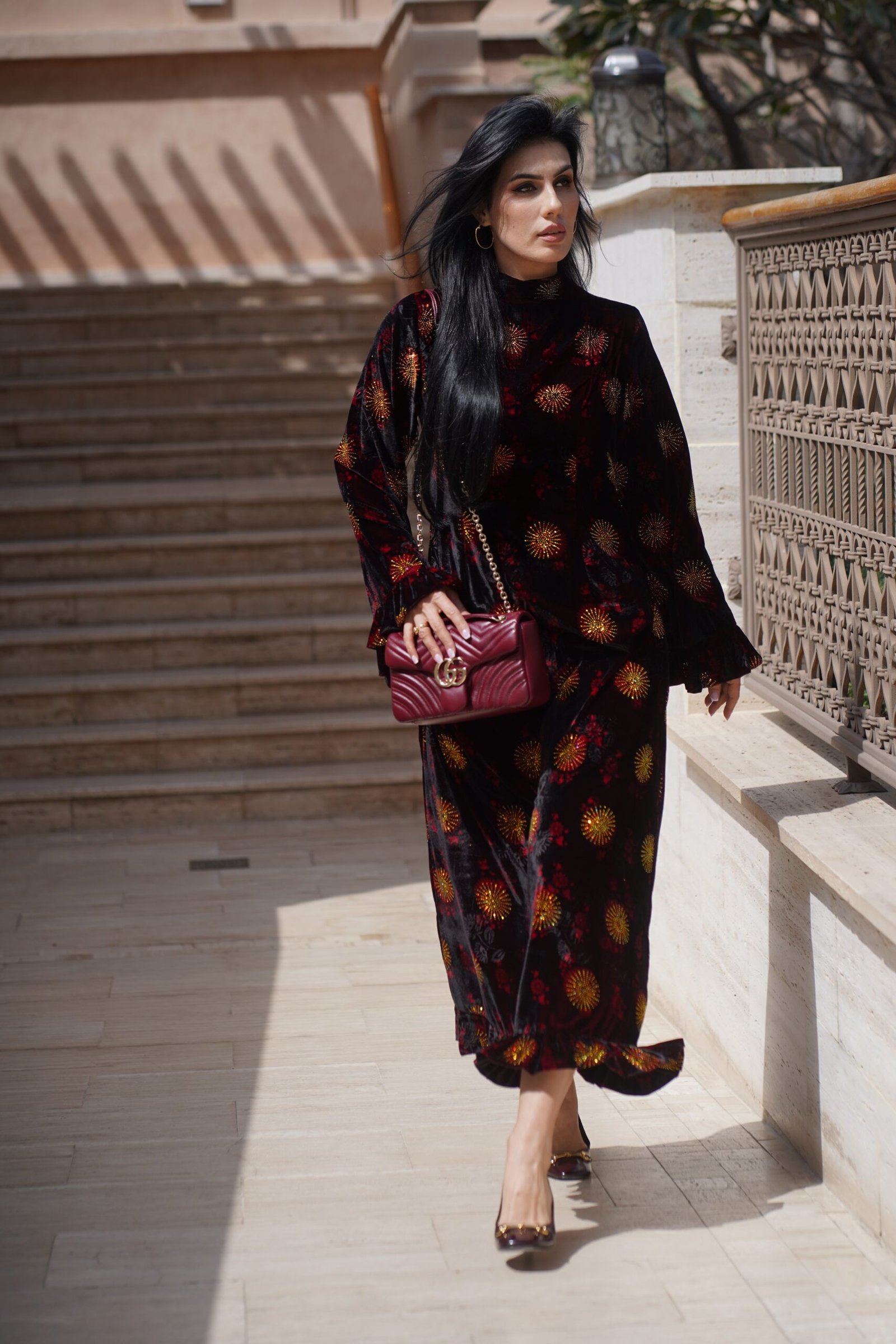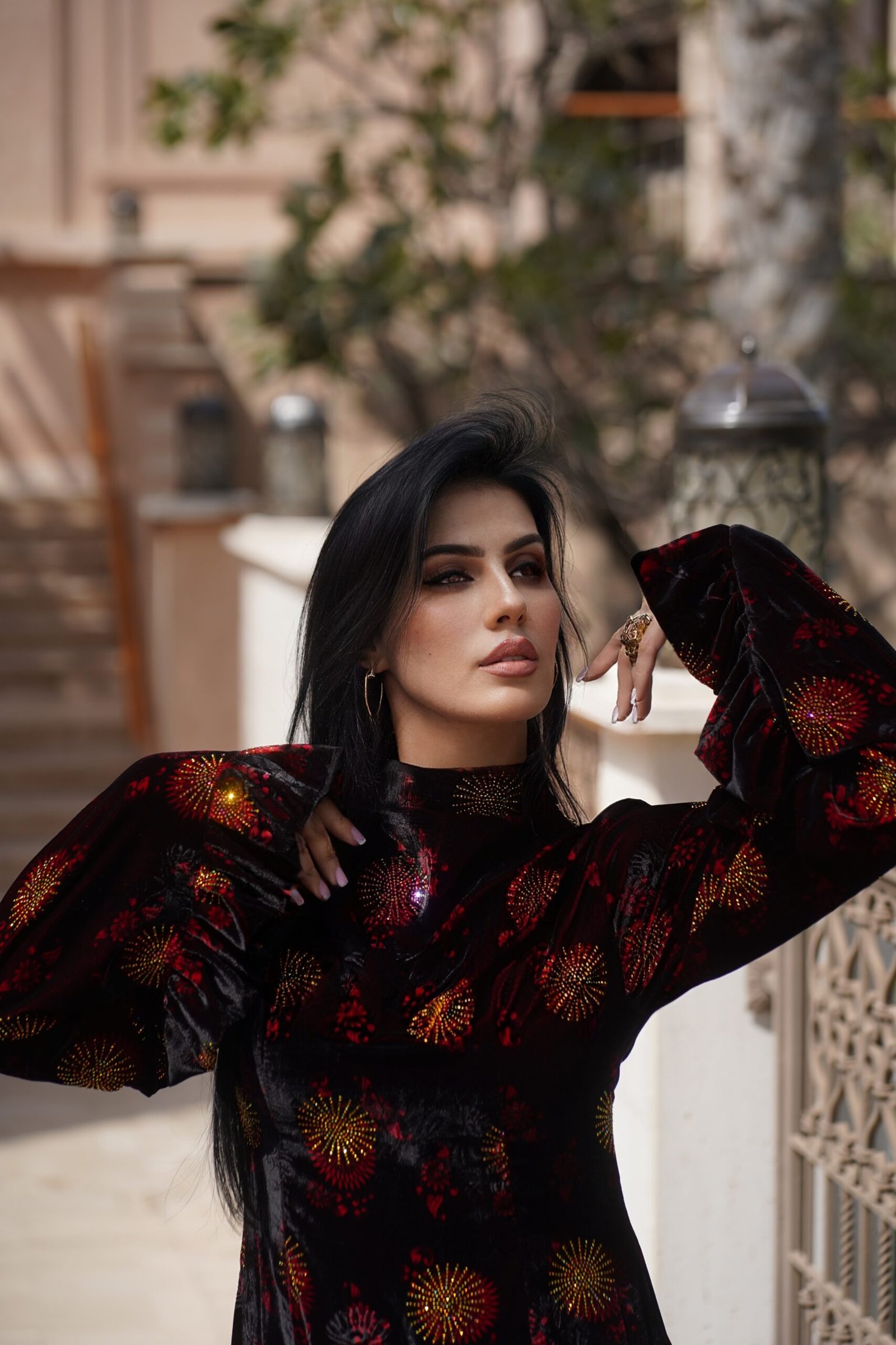 Motivet me shpërthime drite në ar dhe të kuqe krijojnë një efekt magnetik, duke e bërë këtë fustan një deklaratë moderne të femrës së fuqishme. Të gjithë do të pyesin ku e ke blerë sepse ky nuk është thjesht një fustan.